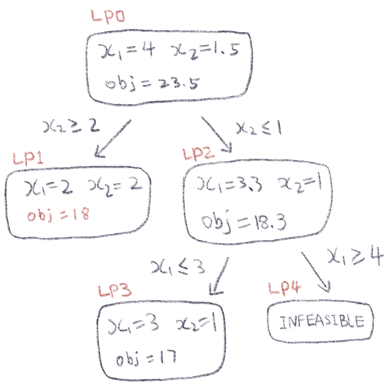 从根节点 root 开始,计算它的最优解,如果是分数解,就按上面的方法进行分支得到子问题,用递归的方式对子问题求解,直到子问题是整数解或者子问题无解。